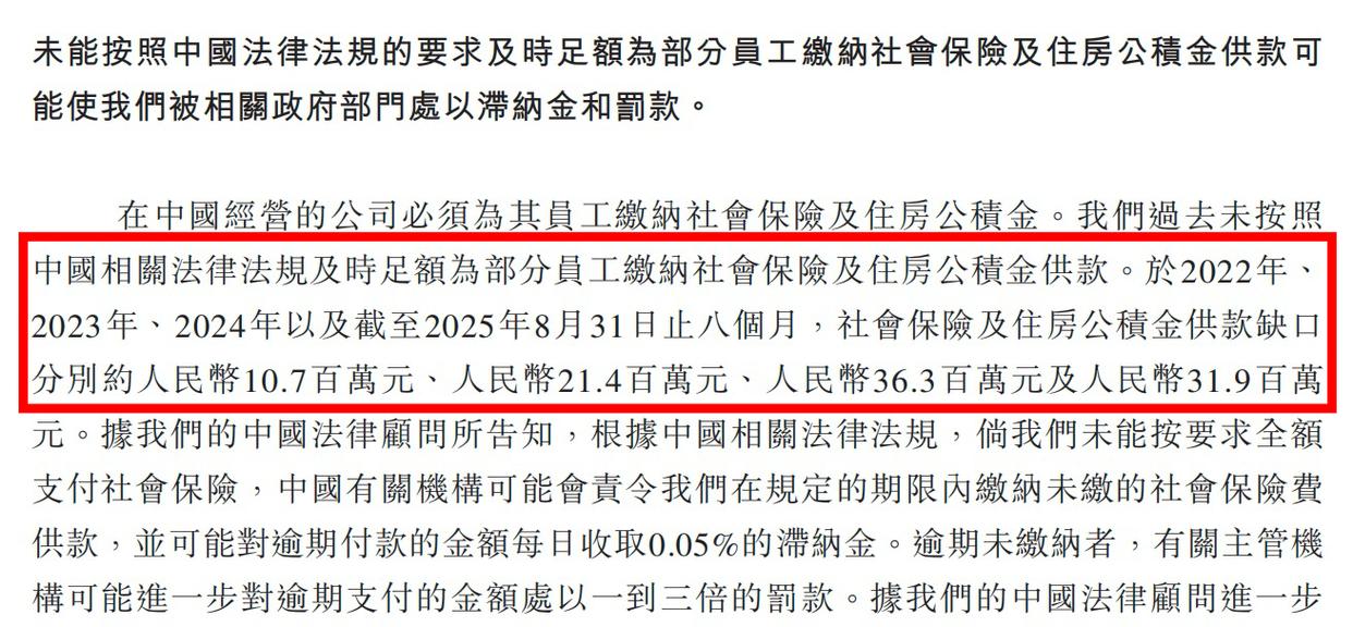 需要关心的是,老乡鸡欠缴员工社保问题照旧存正在,这点其此前正在冲击A股上市时曾收到证监会问询。招股书显示,正在2022年、2023年、2024年以及截至2025年8月31日的八个月,老乡鸡社会安全及住房公积金供款缺口别离为1070万元、2140万元、3630万元及3190万元,合计超1亿元。同期因社会安全差额而可能面对罚款的潜正在最高罚款额则将别离约为1610万元、4270万元、8190万元及7470万元。