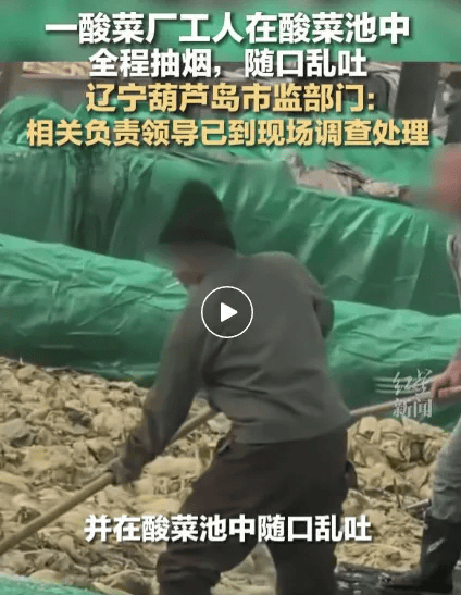 这位辽宁网友发布正在社交平台的视频显示,一须眉坐正在酸菜池顶用钢叉将酸菜翻动并铲至一旁,并正在酸菜池中随口乱吐。
