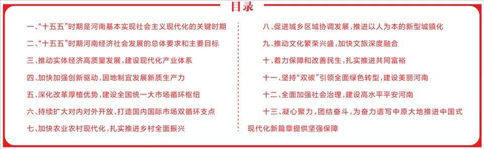 1。“十四五”期间河南成长次要成绩。“十四五”期间,正在以习同志为焦点的顽强带领下,省委连合率领全省人平易近深切落实中部地域加速兴起、黄河道域生态和高质量成长等国度计谋摆设,住世纪疫情严沉冲击,履历了“7·20”特大暴雨灾祸,无效应对一系列严沉风险挑和,稳中求进、克难攻坚,全省经济社会成长取得较着成效,高质量成长高效能管理结实推进。现代化财产系统加速建立,新兴支柱财产稳步成长,规模以上工业实现41个大类行业全笼盖,超硬材料、现代农机配备成为国度先辈制制业集群。科技创重生态不竭优化,国度生物育种财产立异核心建成投用,一批全国沉点尝试室成功入列,一批新型研发平台加速扶植。城乡区域协调成长深切推进,郑州都会圈规划获批实施,村落全面复兴结实推进,脱贫攻坚巩固拓展,平易近生保障不竭提高。动力持续加强,“高效办成一件事”鞭策政务办事提质增效,郑州—“空中丝绸之”成为“一带一”共建的靓丽手刺,融入办事全国同一大市场扶植成效初显。全过程人平易近深切成长,全面依省结实推进。文旅融合纵深推进,文化事业和文化财产加速成长。绿色低碳转型深切实施,黄河干流水质持续不变达到Ⅱ类,南水北调中线工程水源地及干渠水质不变正在Ⅱ类及以上。平安成长根本持续夯实,党建引领下层高效能管理无力有序无效,社会管理结实推进。管党治党愈加无力,集中进修教育深切开展,党组织功能和组织功能不竭加强,风清气正的生态巩固提拔,努力谱写华夏大地推进中国式现代化新篇章,华夏儿女迈出新的程序。这些成绩的取得,底子正在于以习同志为焦点的领航掌舵,正在于习新时代中国特色社会从义思惟科学,是全省上下服膺习总嘱托连合奋斗的成果。2。“十五五”期间河南成长面对史无前例的形势。当前和此后一个期间,世界百年变局加快演进,新一轮科技和财产变化加快冲破,我国成长面对深刻复杂变化,计谋机缘和风险挑和并存、不确定难意料要素增加;同时我国经济根本稳、劣势多、韧性强、潜能大,持久向好的支持前提和根基趋向没有变。河南做为生齿大省、经济大省、农业大省,既充满新的计谋机缘,也面对严沉风险挑和,总体看机缘大于挑和。出格是跟着中部地域加速兴起、黄河道域生态和高质量成长等国度计谋深切实施,以及国度鼎力实施扩大内需计谋、纵深推进全国同一大市场扶植,有益于我省阐扬区位交通便当、市场规模复杂、财产系统完整、人力资本丰硕、文化底蕴深挚等浩繁劣势,乘势而上加速现代化扶植程序,正在融入办事全国同一大市场扶植中强化“枢纽”“支点”功能,提拔正在全国成长大局中的位势能级。同时也要看到,我省成长不均衡不充实矛盾仍较凸起,面对人均程度低、立异能力不强、都会圈和核心城市能级不敷、对外总体程度不高、农业农村现代化相对畅后等问题,高校布局不优、科研能力不强,文创财产、文旅消费尚待深切挖掘,部门企业运营坚苦,生态环保、防洪排涝、平易近生保障存正在短板弱项,区位、人力资本等劣势有待进一步为成长劣势,生齿布局变化给高质量成长、高效能管理提出新课题,沉点范畴还有风险现患。习总心系华夏大地、情牵河南人平易近,党的以来多次亲临我省调查指点。出格是正在“十四五”规划收官、谋划“十五五”成长的环节期间,再次亲临我省调查,提出“努力谱写华夏大地推进中国式现代化新篇章”奋斗方针和“两高四出力”严沉要求,为河南经济社会成长标的目的、明白径,极大凝结和提振了华夏儿女连合奋斗的决心决心。谋划推进“十五五”期间经济社会成长,必需一直把习总正在河南调查时主要讲话和关于河南工做的主要阐述做为底子遵照。“十五五”期间正在根基实现社会从义现代化历程中具有继往开来的主要地位,是夯实根本、全面发力的环节期间,也是河南扬长补短、全面兴起的环节阶段。全省上下必需认识所处的汗青方位,深刻“两个确立”的决定性意义,加强“四个认识”、果断“四个自傲”、做到“两个”,连结计谋定力,加强必胜决心,提质增效、提档进位,以汗青自动克、和风险、提效能、抓立异,静心苦干、砥砺奋进,努力开创华夏大地推进中国式现代化扶植新场合排场。3。“十五五”期间经济社会成长的总体要求。思惟、理论、“”主要思惟、科学成长不雅,全面贯彻习新时代中国特色社会从义思惟,深切进修贯彻习总正在河南调查时主要讲话和关于河南工做的主要阐述,深切贯彻党的二十大和二十届历次全会,统筹推进“五位一体”总体结构,协调推进“四个全面”计谋结构,完整精确全面贯彻新成长,稳中求进工做总基调,以经济扶植为核心,以鞭策高质量成长为从题,以立异为底子动力,以满脚人平易近日益增加的夸姣糊口需要为底子目标,以全面从严治党为底子保障,深切落实中部地域加速兴起、黄河道域生态和高质量成长等国度计谋,积极融入办事新成长款式和全国同一大市场扶植,聚焦“1+2+4+N”方针使命系统,果断决心鞭策高质量成长高效能管理,出力扶植现代化财产系统和农业强省,出力改善平易近生、加强社会管理,出力加强生态,出力鞭策文化繁荣昌隆,防风险、扬劣势、补短板、强保障,鞭策经济实现质的无效提拔和量的合理增加,鞭策人的全面成长、全体人平易近配合敷裕迈