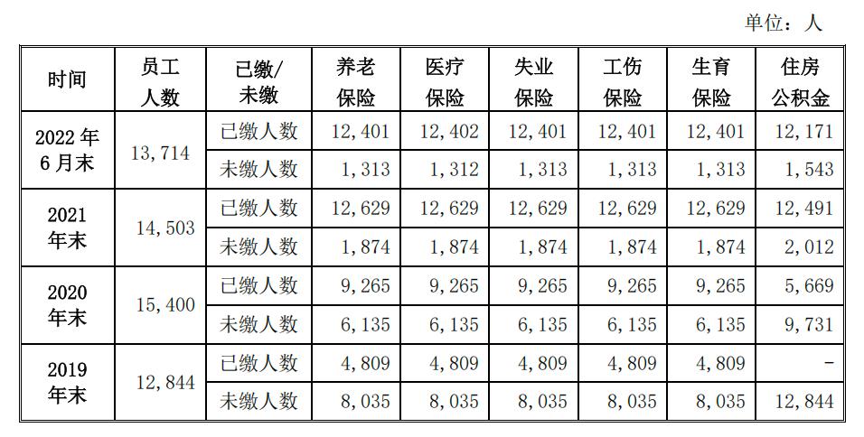 此前寻求A股上市期间,老乡鸡就曾因未脚额缴纳社保和公积金问题激发大量会商。据此提交的招股书显示,2019年、2020年、2021年及2022年上半年,老乡鸡员工总数别离为12844人、15400人、14503人和13714人,此中未缴纳社保(养老、医疗、赋闲、工伤、生育五项安全)的人数别离为8035人、6135人、1874人和1313人,未缴纳比例别离为62。55%、39。84%、12。92%和9。57%。